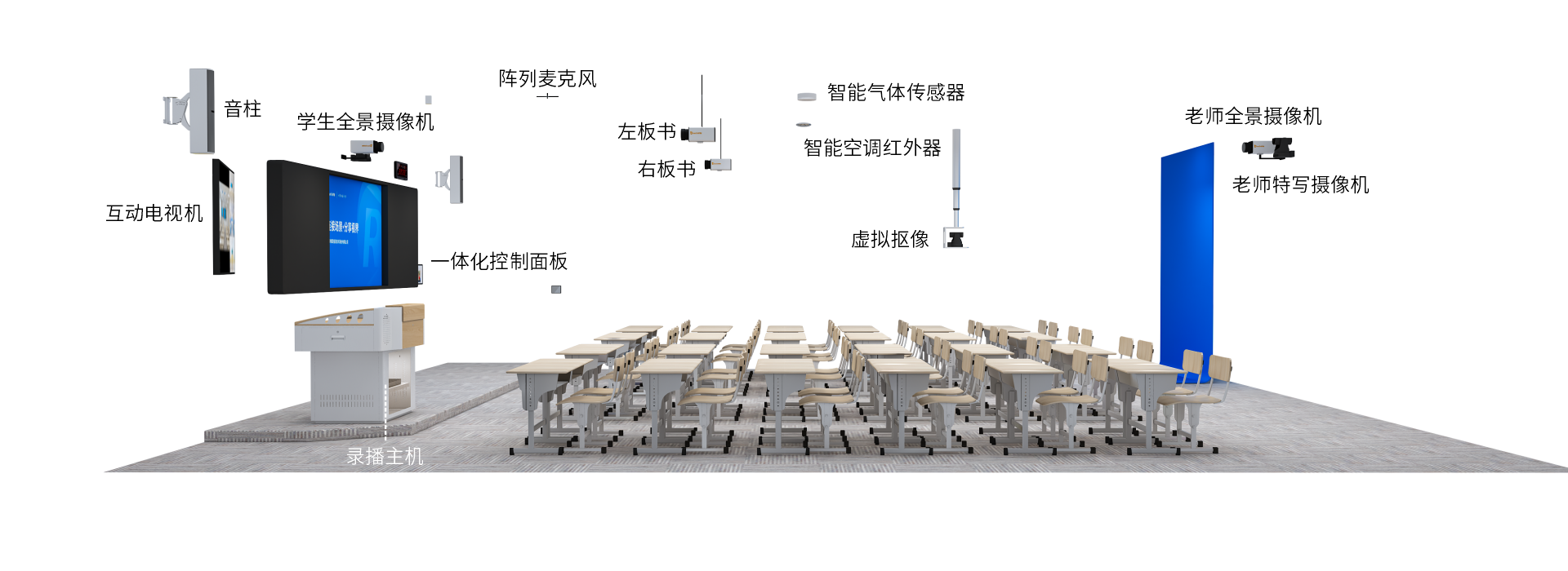 銳取精品錄播教室采?七個機位打造,并且向下兼容多種機位?案。不僅?動跟蹤記錄上課過程的多個場景,還?持遠程互動教學。并集合虛擬摳像功能,師?可?由選擇2D、3D場景,?室多?,滿?精品課程錄制、遠程互動教學、虛擬微課制作等多種需求。
