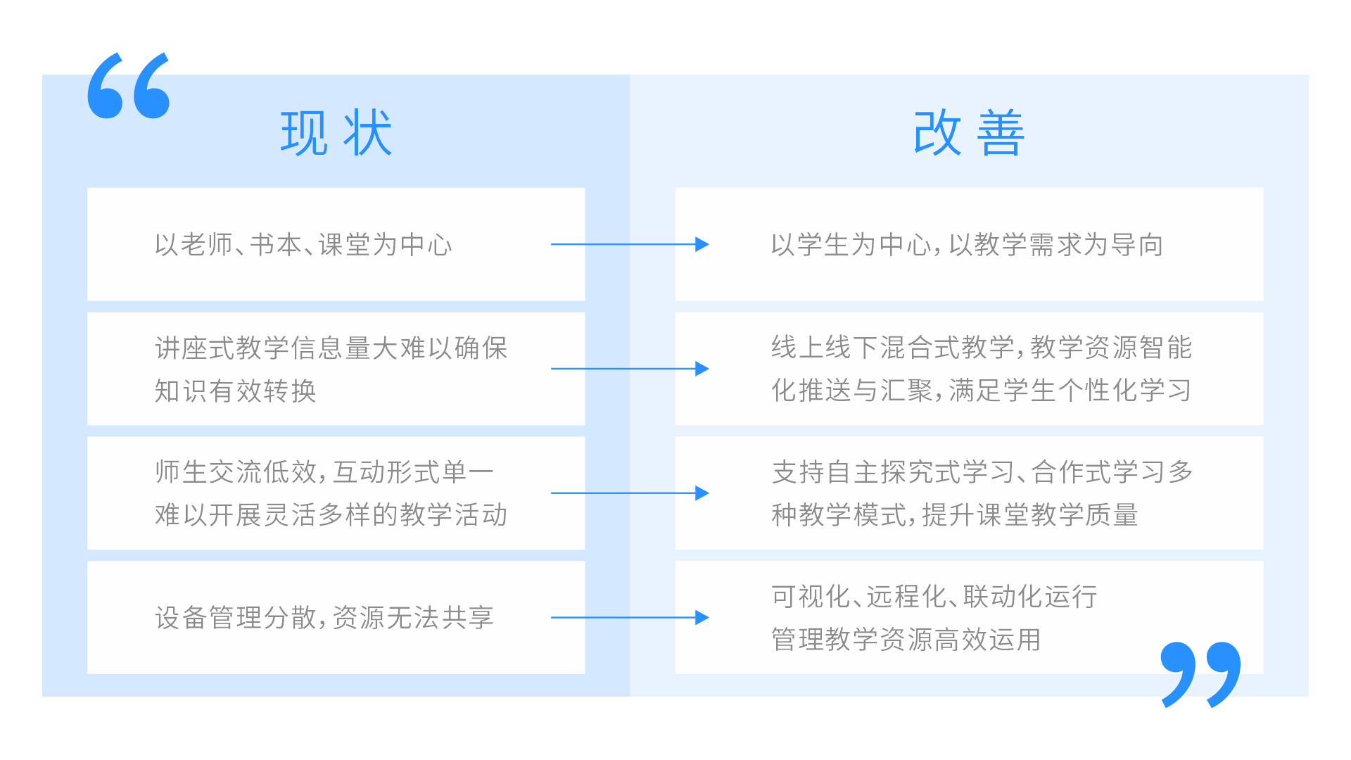 銳取智慧教室解決?案以學?為中?,構建?個智能互動、協作交流、泛在學習的教學環境;結合線上線下相結合的混合式教學模式,提?教師信息化應??平,激發學?學習興趣和主動性,提?課堂教學效率和效果,從?促進教育信息化教學改?和創新。